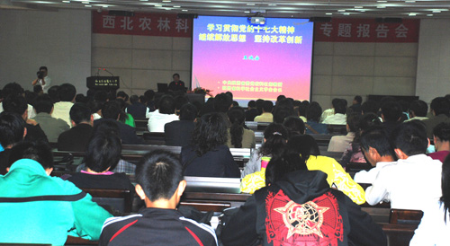 9月24日下午,我校邀请陕西省科学社会主义学会会长、中共陕西省委党校科社部教授王诚安,在国际交流中心207会议室,为我校教职员工作题为“学习贯彻党的十七大精神,继续解放思想,坚持改革创新”的专题报告。学校常务副校长赵忠,校党委副书记、副校长王革,校党委副书记徐养福,学校解放思想大讨论活动领导小组成员和全校处级干部、机关部门科级以上干部、各学院(系、所)教职工代表以及部分统一战线成员、离退休职工代表、机关一二党委全体党员300人参加了报告会。报告会由校党委副书记徐养福主持。