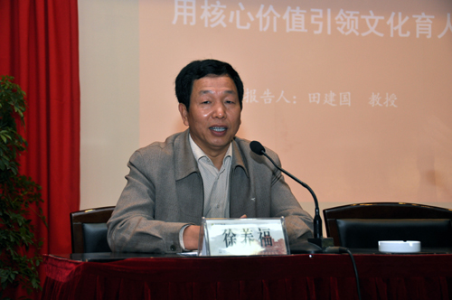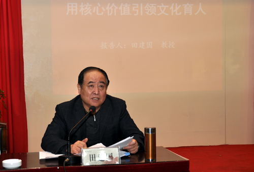在“用核心价值引领文化育人”专题报告中,田建国教授从用核心价值引领社会思潮、用核心价值引领育人理念、用核心价值引领思想道德建设、用核心价值引领民族精神、用核心价值引领创新文化5个方面对用核心价值引领文化育人进行了详细阐释。田建国强调,高校一定要重视意识形态建设,树立以学生为本的核心理念,突出理想信念教育、现代公民教育、社会责任教育、人文素质教育,用大学文化来影响、改变社会风气,为建设文化强国作出应有贡献。