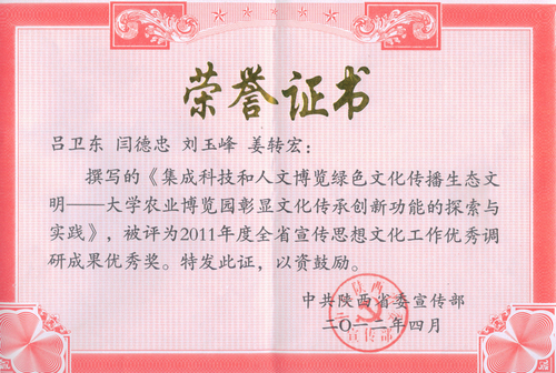 会议表彰了2011年度全省宣传思想文化调研工作先进单位、先进个人和优秀调研成果。我校报送的《集成科技和人文博览绿色文化传播生态文明—大学农业博览园彰显文化传承创新功能的探索与实践》获得调研成果优秀奖,姜转宏同志被评为全省宣传思想文化调研工作先进个人。
