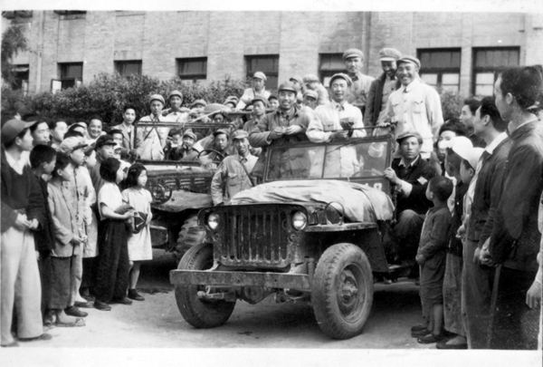 1949年5月20日,王震将军来到西北农学院看望师生员工(车上左起:第一野战军二军军长王震,副军长郭鹏,参谋长张希钦,副政委王恩茂,副军长顿星云)