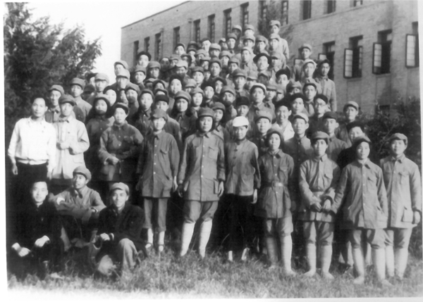 战事紧促,师生恋恋不舍地簇拥着王震和王恩茂一行来到大楼前合影留念。