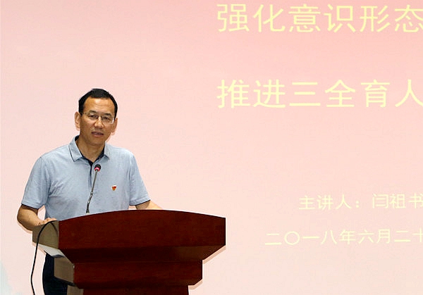 闫祖书以《强化意识形态责任,推进三全育人工作》为主题,从什么是意识形态概念出发,用许多事例从意识形态工作的重要性、面临的挑战、学校意识形态工作存在问题及薄弱环节和如何落实意识形态责任等4个方面做了深入浅出的讲解。