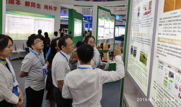 我校博览会展位由党委宣传部牵头设计制作,占地面积225平方米,总体造型美观大方、色调高雅,充分体现了农林学科特点和生态理念,通过科技成果、研究生创新作品、展板、宣传彩页等多种方式,集中展示了学校近年来在人才培养、科技推广、教育扶贫、大学生创新创业等方面取得的丰硕成果。