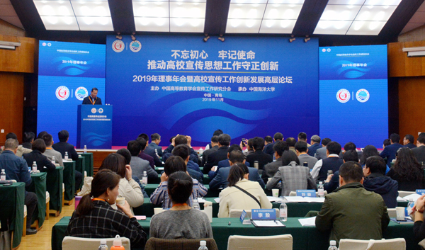 11月1日-3日,中国高等教育学会宣传工作研究分会2019年理事年会暨高校宣传工作创新发展高层论坛在中国海洋大学召开,来自全国各地的理事、会员、新闻媒体,以及各高校专家学者170余人围绕“不忘初心、牢记使命,推动高校宣传思想工作守正创新”这一主题,交流经验,研讨方法,分享成果,共谋高校宣传思想工作创新发展之路。我校党委副书记闫祖书作为中国高等教育学会宣传工作研究分会副理事长主持了理事大会,宣传部郭建东、孔亮参加了论坛。